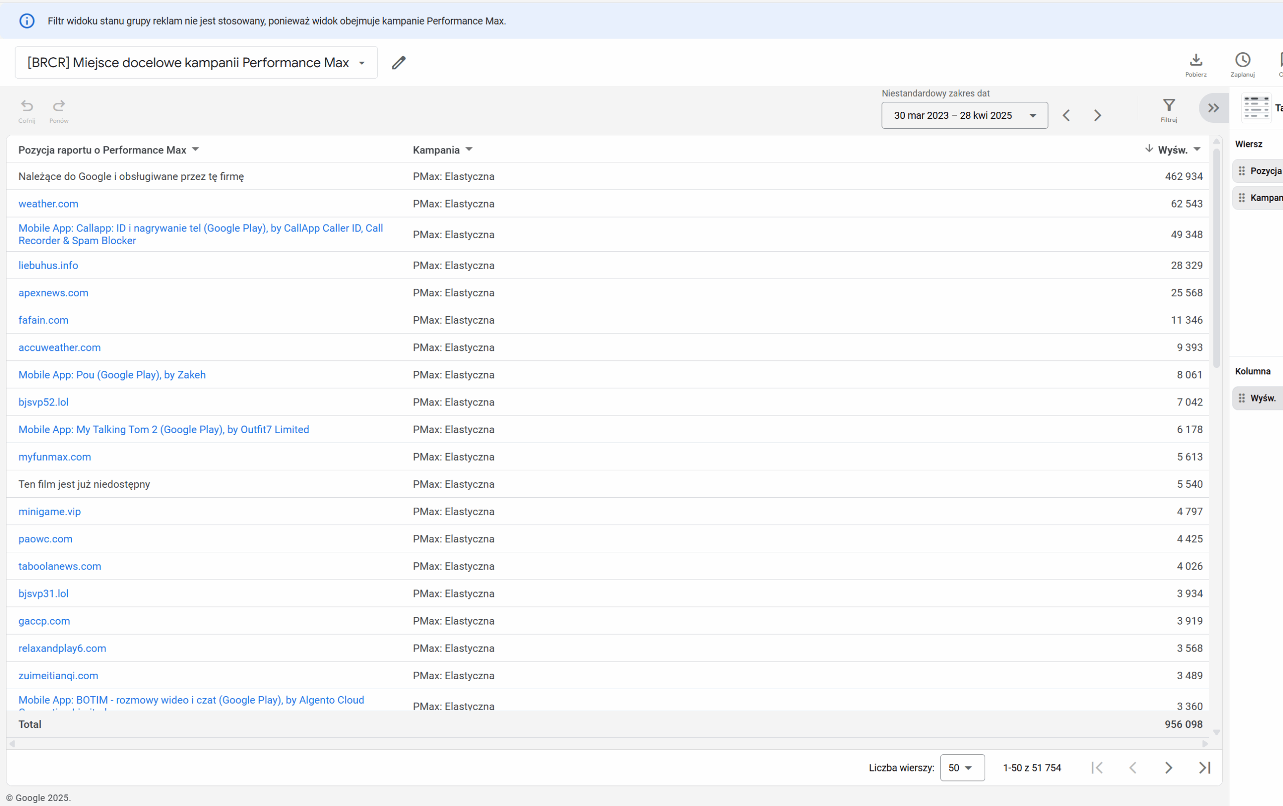 Wybieramy kampanię PMAX -> Statystyki i raporty -> Edytor raportów -> Musimy dodać wiersz pozycja raportu o PMAX, Kampania. Jako Kolumnę dodać WYŚWIETLENIA