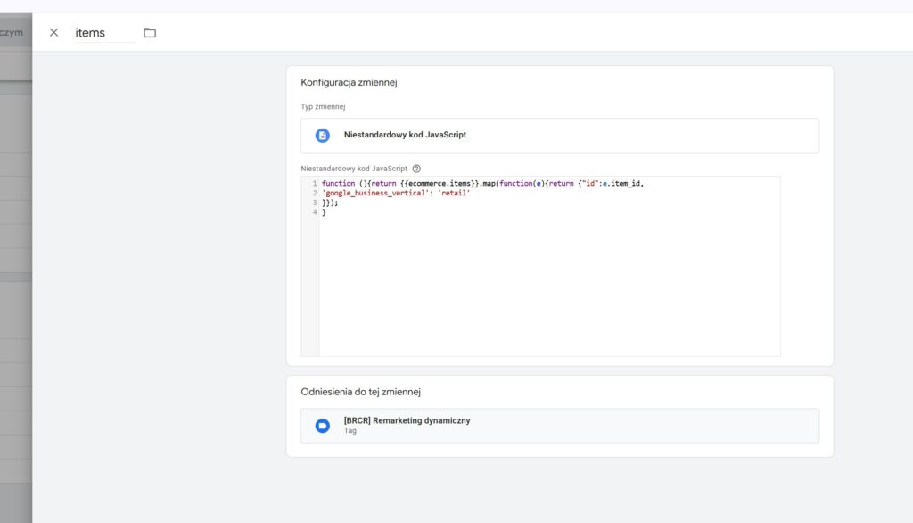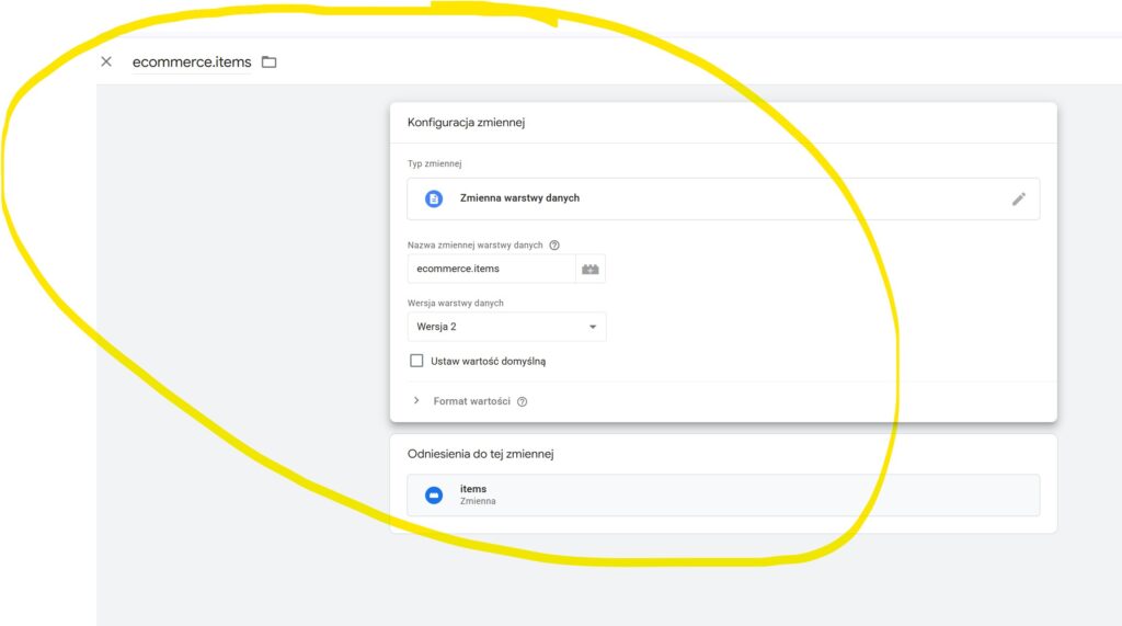 3.Następnie zmienną ecommerce.items – zmienna warstw danych ecommerce.items