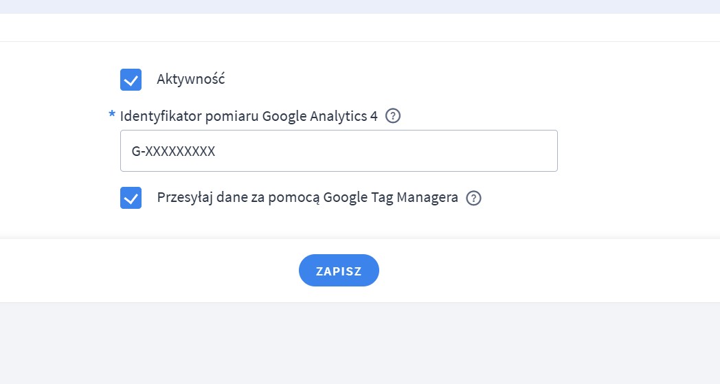 - Wchodzimy w inne integracje -> dajemy w Google Analytics G-xxxx i zaznaczamy oba checkboxy. Konfigurację GA4 będziemy robić przez GTM a to jest potrzebne żeby włączyć wysyłanie danych do GTM