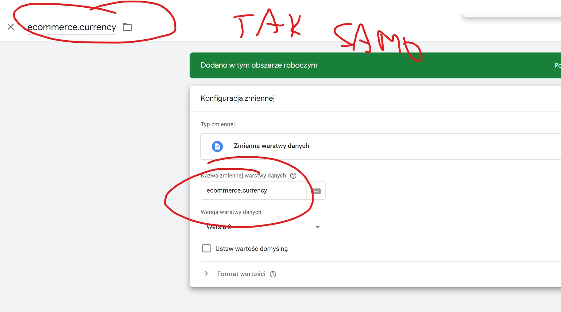 Przechodzimy do zmiennych -> nowa -> zmienna warstwy danych -> nazywamy ją zgodnie z warstwami przesyłanymi przez sklep internetowy podczas wykonywania zakupu -> Dla shopera jest to ecommerce, ecommerce.value, ecommerce.currency, (MOŻEMY TEŻ DODAĆ DLA NASTĘPNYCH KROKÓW JUŻ TEŻ ZMIENNE ecommerce.transaction_id