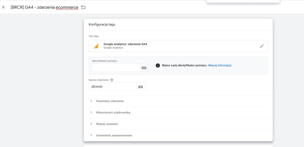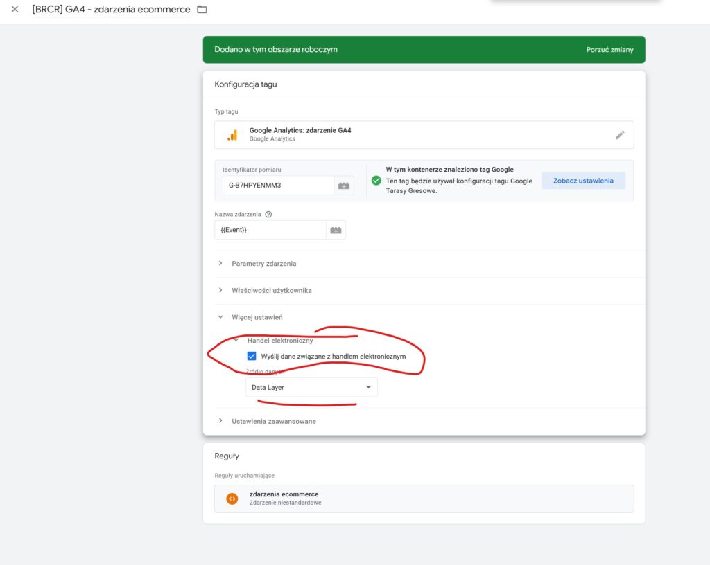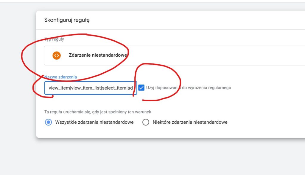 W analytics dodajemy jeden tag zbiorczy dla wielu zdarzeń. -> TAG + -> Google Analytics zdarzenie GA4 -> Identyfikator pomiaru to G-xxx -> nazwa zdarzenia EVENT (z klocka lego)-> jako regułę dajemy nowa reguła -> nazwa zdarzenia ecommerce -> zdarzenie niestandardowe -> użyj do wyrażenia -> następnie wklejamy to: