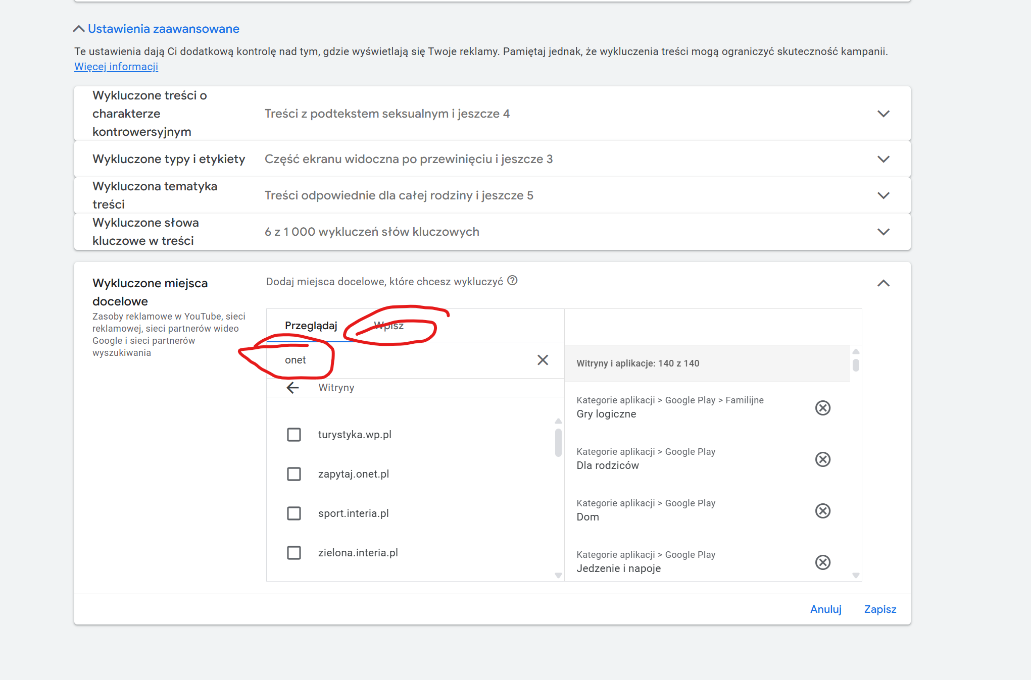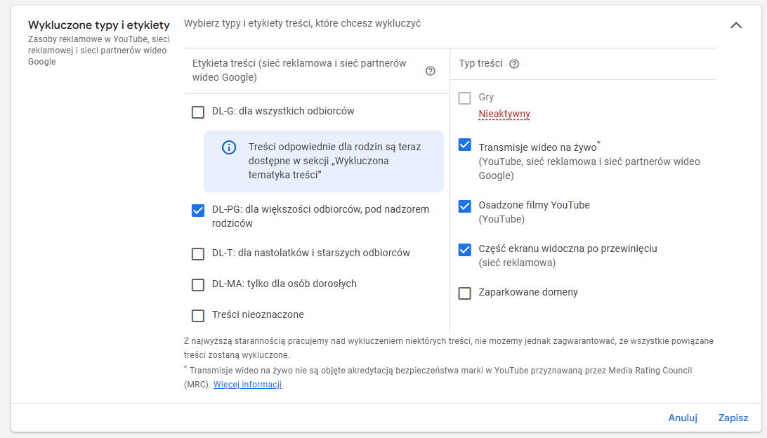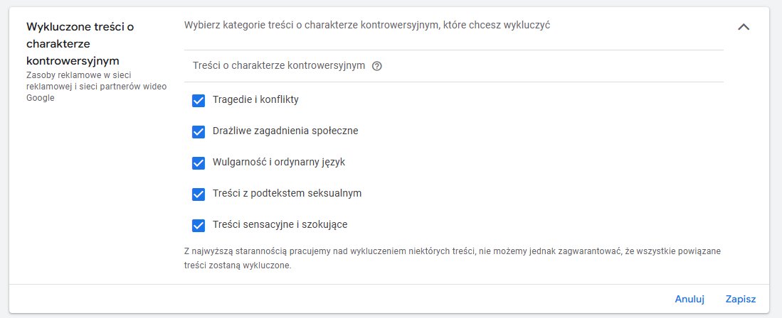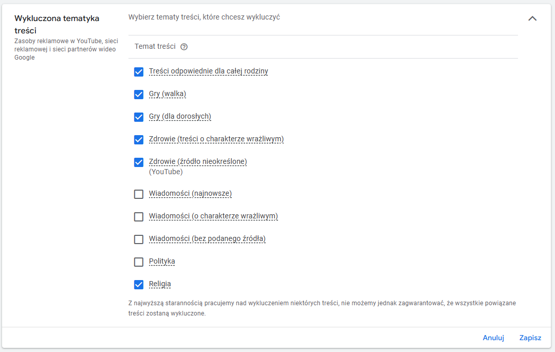 Wykluczenia treści dla całego konta: