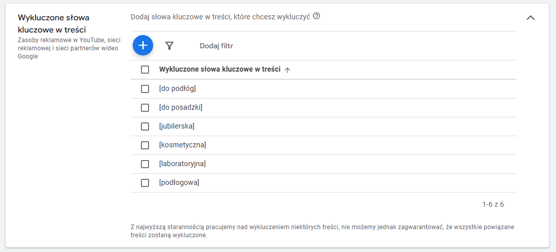Ma to sens jak chcemy wykluczyć frazy dla całego konta. Wchodzimy w NARZĘDZIA -> Dopasowanie treści ->